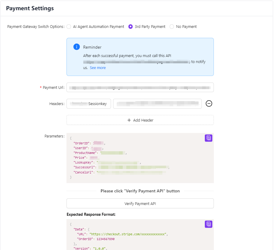 - Click the “Verify Payment API” button. If the interface operates correctly and returns the expected response, the validation will pass.